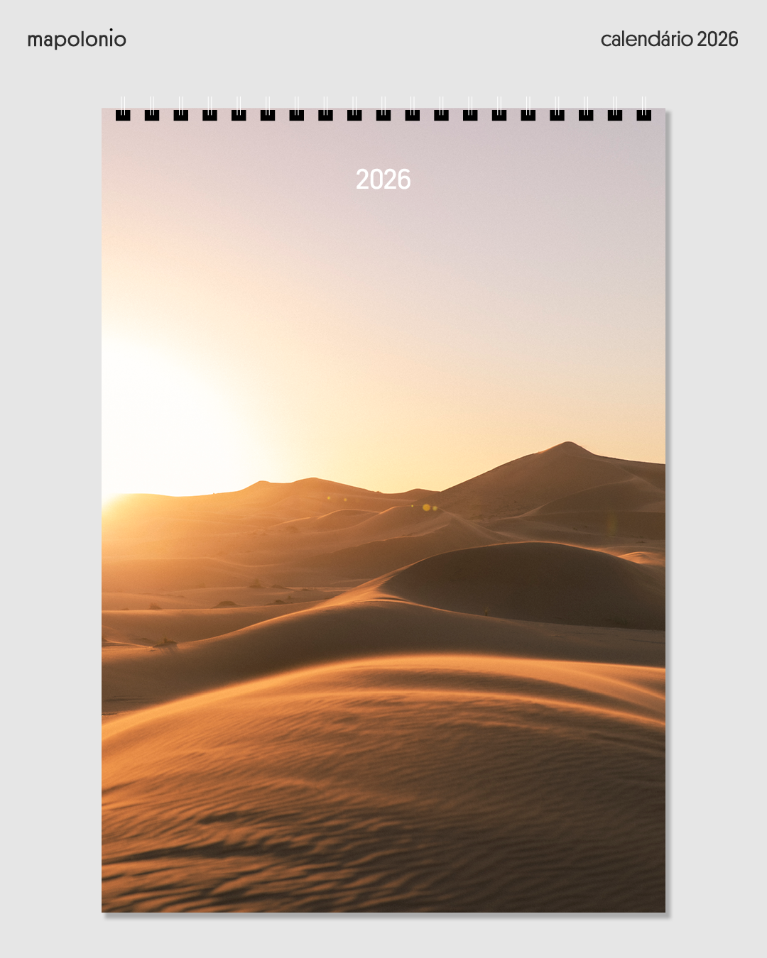 Calendário de parede 2026 com imagens exclusivas da fotógrafa Marilia Apolonio. Com um design minimalista e elegante, traz inspiração através de paisagens ao redor do mundo.